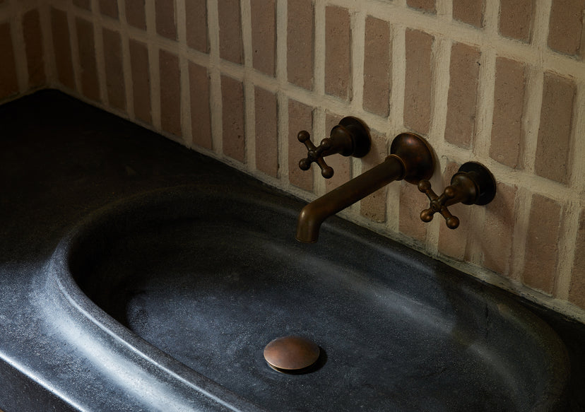 A pleasing admixture of provenance and period fulfills the desire to “mess up the hair of the house”: custom furniture of the Studio’s own design — a sofa the color of saffron, tactile tables hewn from local lava stone; vintage Postwar examples — Pierre Chapo, Jeanerret, Noguchi. A bar of locally-sculpted brass rings a half-round form that hugs the structure, creating a self-contained entertaining space.