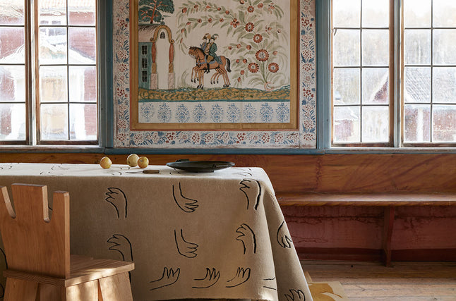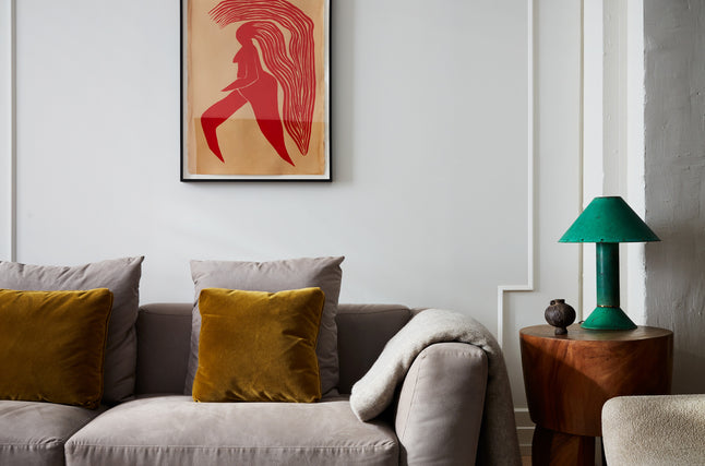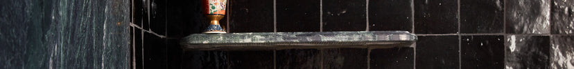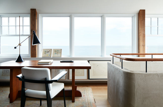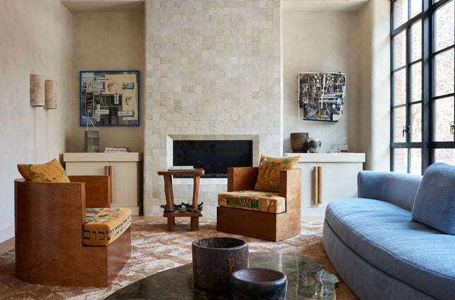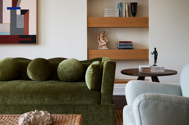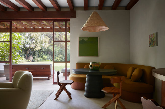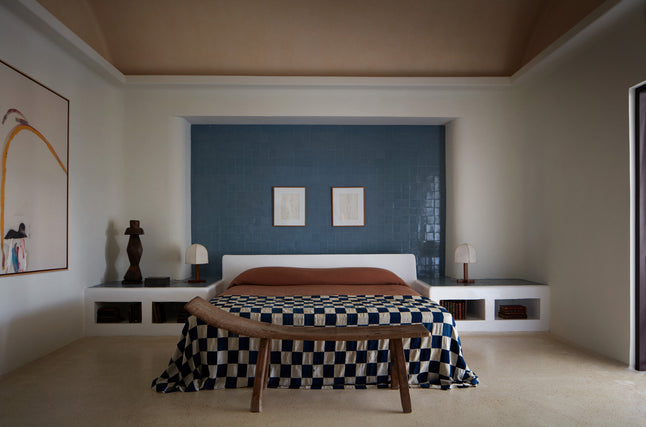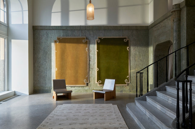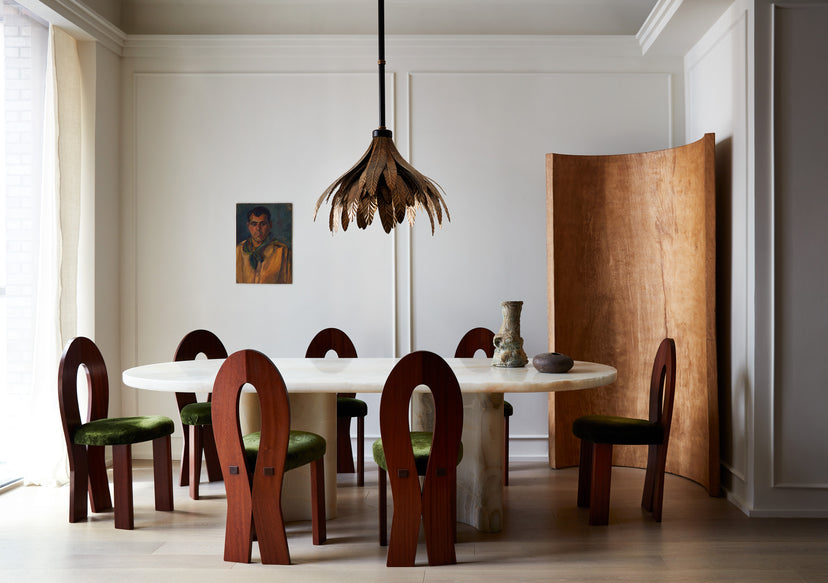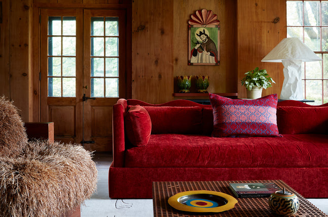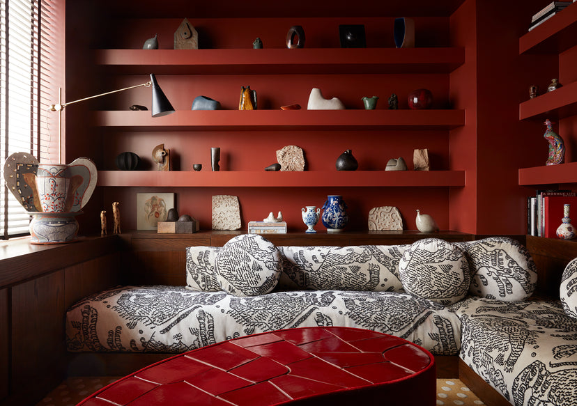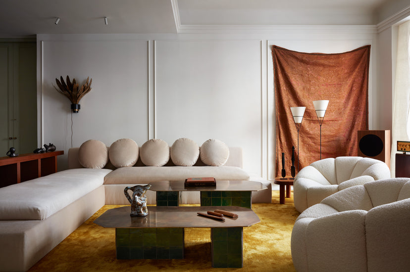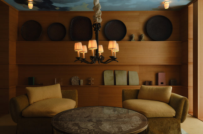 As it so often does, color controls the mood. A smoking den in lacquer red to match a low tortoise-tiled table licked with crimson velvet; a spiced saffron rug; wall-to-wall silk green carpet, like a luxurious moss underfoot. The studio’s own designs permeate: a solid sheet brass table, the suite of Fin ribbon chairs; a Plateau lamp.
