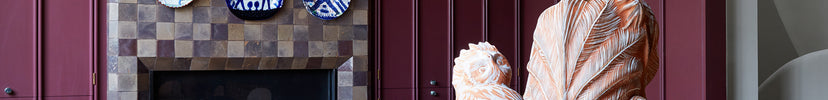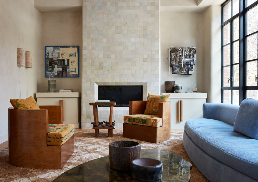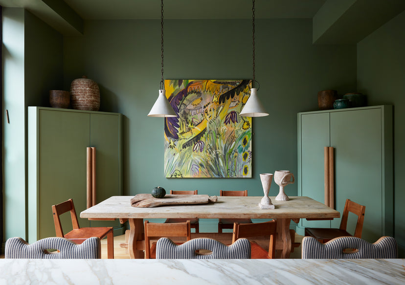 Color is the catalyst, six floors dipped in a saturated palette of deep emeralds, mauves, pistachios, and cotton candy blues. A traditional delineation of functional spaces allows for each room to be dialed to their own frequency — cool in the sunlight-suffused sitting room, emotive in the dining spaces, calm in the private ones. Custom furniture throughout the project was purpose-built: a massive table for large-format dinners; perfectly nestled storage; a pair of club chairs, a collaboration with Green River Project and Bode, features corduroy upholstery referencing the couple’s deep New York City roots. The home’s spiral staircase is clad in a raised plaster balustrade, a nautilus shell finished in an imperfect childlike hand, like a funny putty Guggenheim spiral, sized for home.