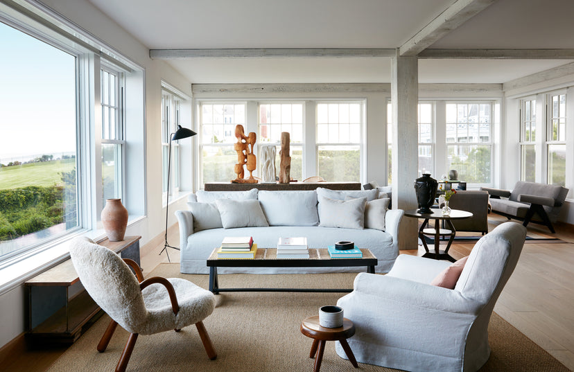 A reimagining of two minds: an acknowledgement of New England vernacular threaded with mid century classicism, each informing the other. Newly expressed beam work resurrects the home’s history without overwhelming its present; rounded ceiling coves create an enveloping cocoon while speaking to the home’s setting by the sea. The widow’s walk becomes a reading room with unimpeded sightlines of the Sound. There’s a philosophical minimalism, if not an explicit one: everything softened, reduced to its most essential. Stairwells wend gracefully into ceilings, plaster and lathe sculpted by local boat building artisans. Touches of lightness appear: an upholstered banquette folds in on itself, a studio signature.